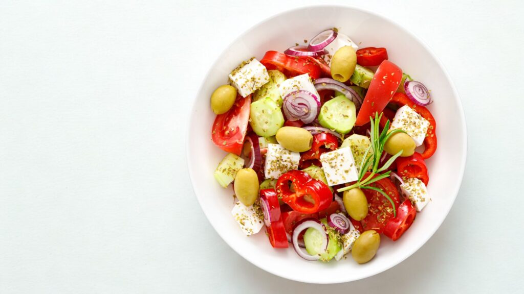 - A motley salad with verdant greens, cherry tomatoes, cucumber, olives, and barred chicken or tuna. Clothing it with olive oil and lemon juice.